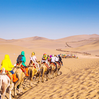六月,敦煌会举行滑沙节、晒腰腿活动,滑沙节选择在月牙泉旁边的鸣沙山,滑沙,就是乘坐滑板从高高的沙山顶自然下滑,滑板用木质、竹子、塑料等材料制成,人们坐在滑沙板上,两手撑在板壁上,双脚蹬住前沿,身体微微向前倾,下滑时随着沙山的坡度加大和下滑速度的加快,顿觉两耳生风,转眼之间就冲到了山下,在有惊无险的瞬间体味到了刺激与快感,每年的这个时候,会有很多喜欢滑沙爱好者前来敦煌徒步游玩,感受飞鹰从山顶俯冲而下的快感。
