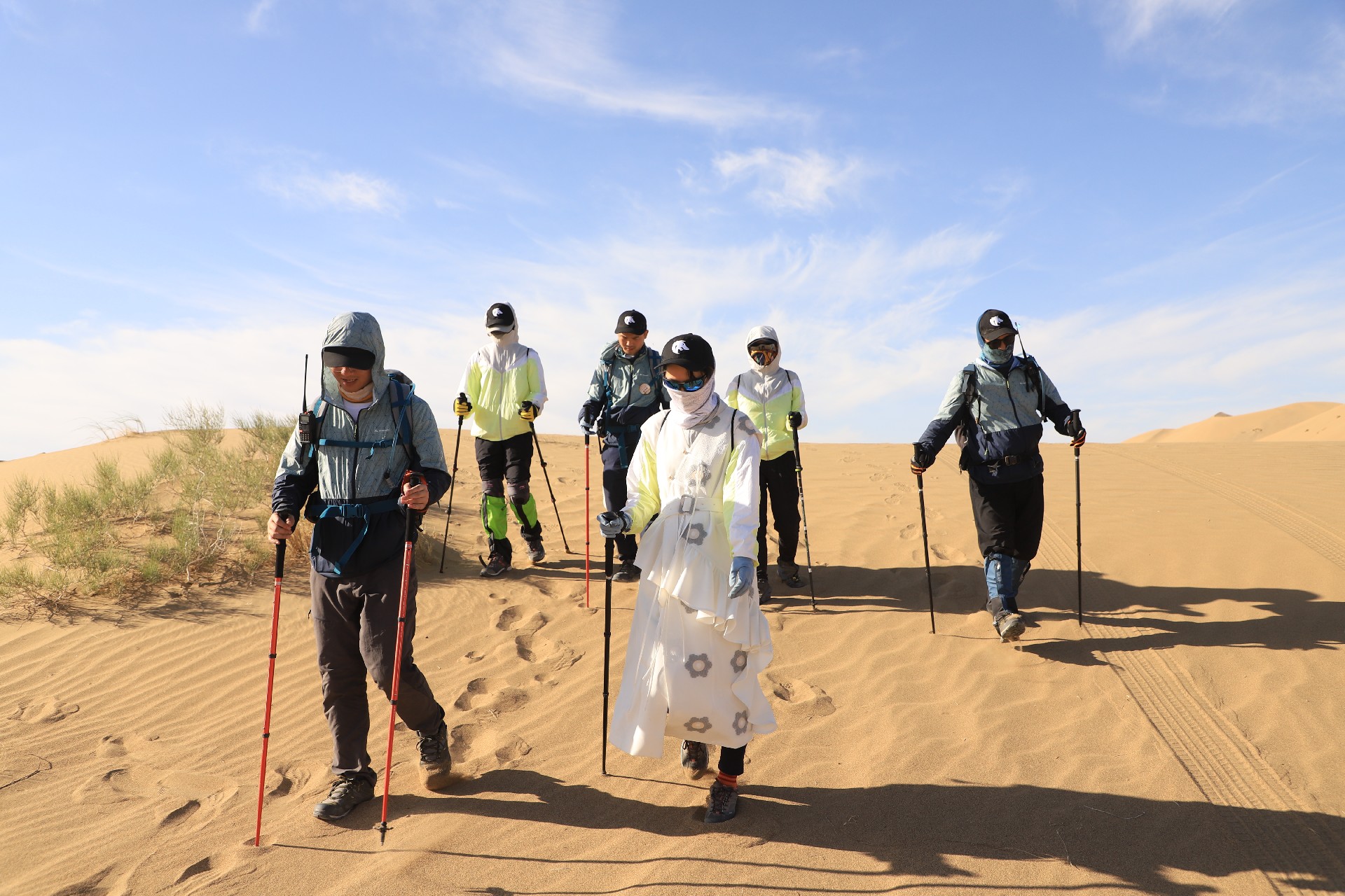 后半程的路,从戈壁一路走到绿洲,又到满是碎石的戈壁滩,黄沙漫天、尘土飞扬。即使可以调整腿部用力姿势,但关节依旧酸痛,后腿肌肉软胀无力。徒步沿途都插满了旗帜,旗上标号提醒我们剩下的里程,忍着疼痛,从日照当头走到日影西斜,旗帜上的数字也终于快要数到末尾。风小了一些,转过一个丘陵,终于看到了营地的轮廓。
